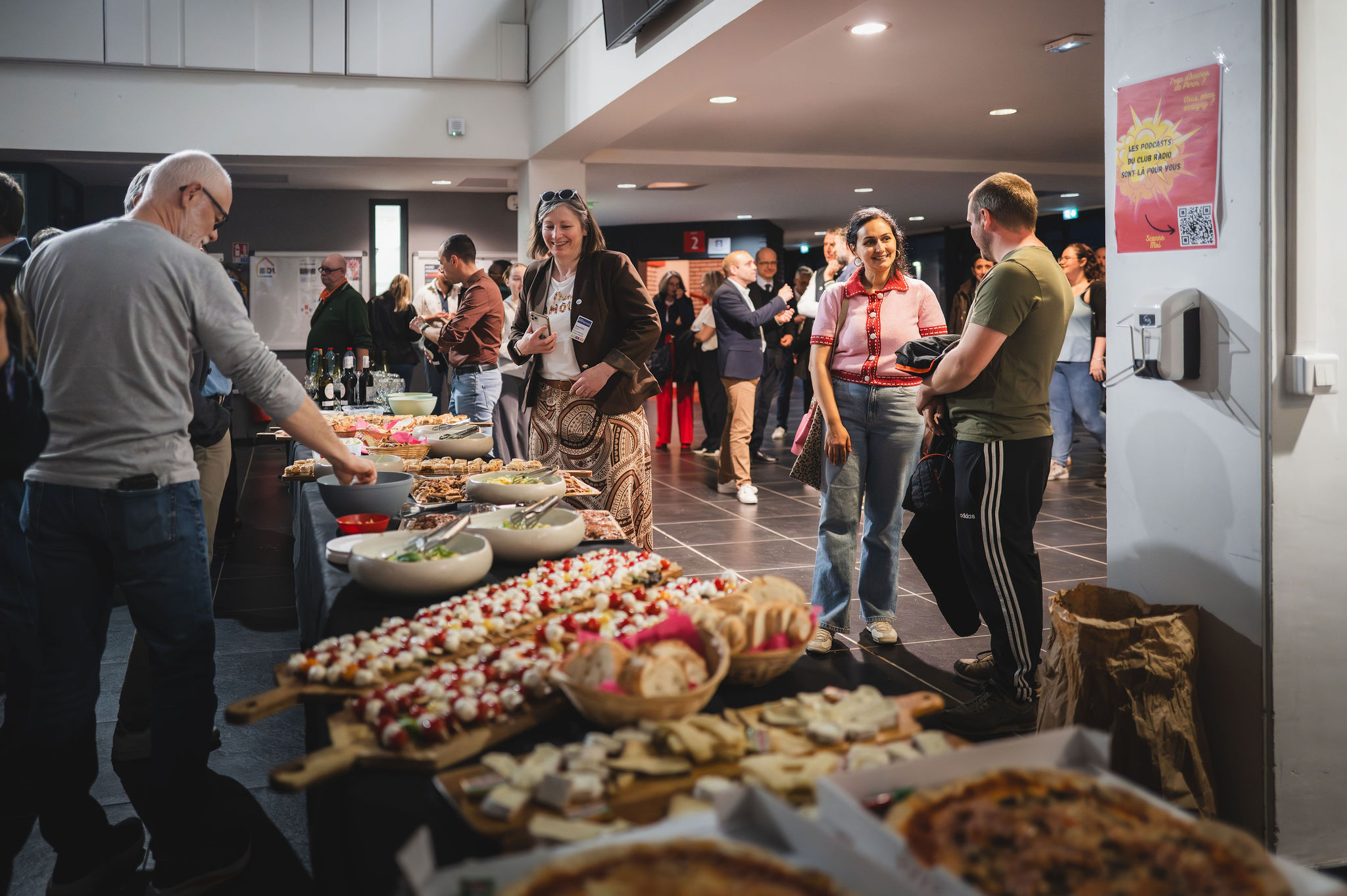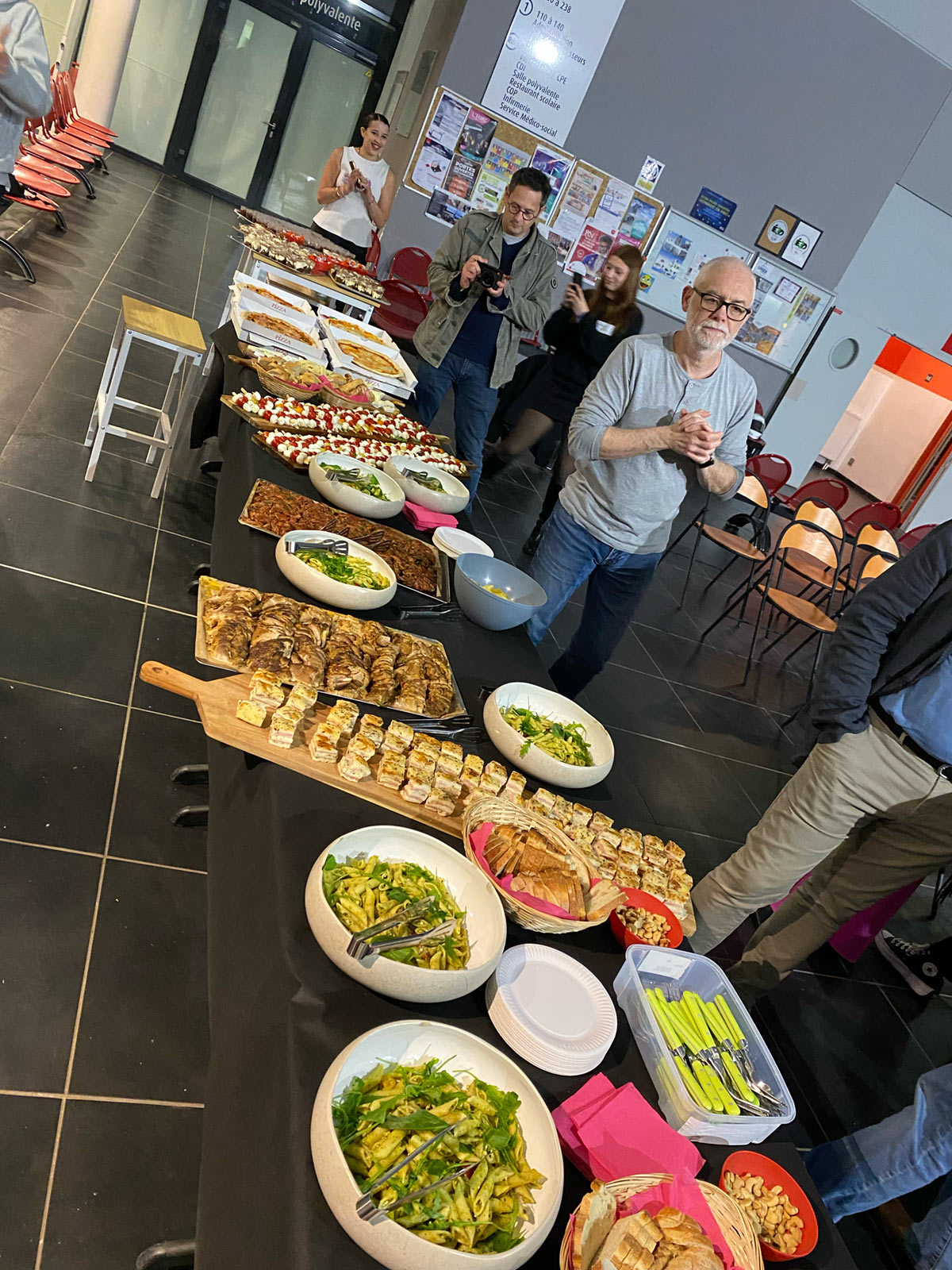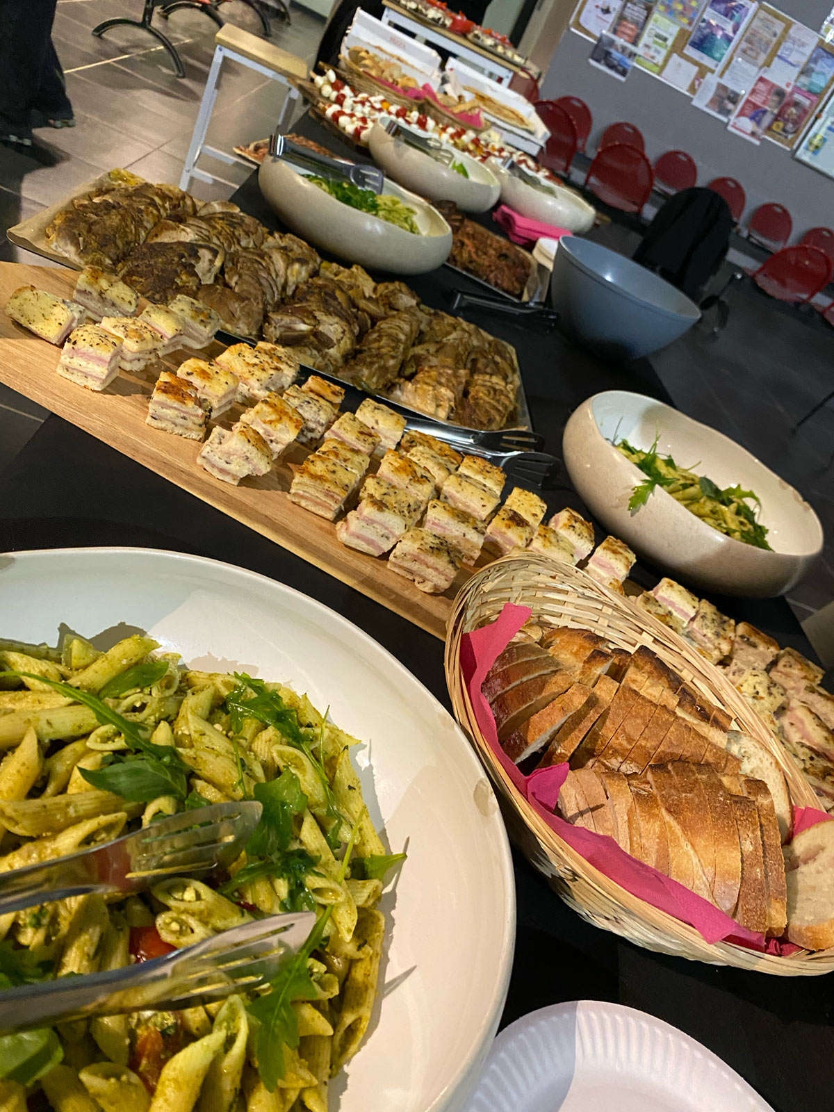 Au menu : salade de pâtes au pesto, tataki de bœuf (validé à l’unanimité 😄), mini croques truffés, pizzas, charcuterie, fromages… De quoi satisfaire toutes les faims… et prolonger les discussions dans la bonne humeur.
